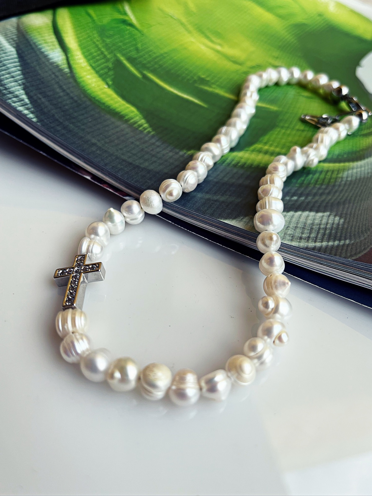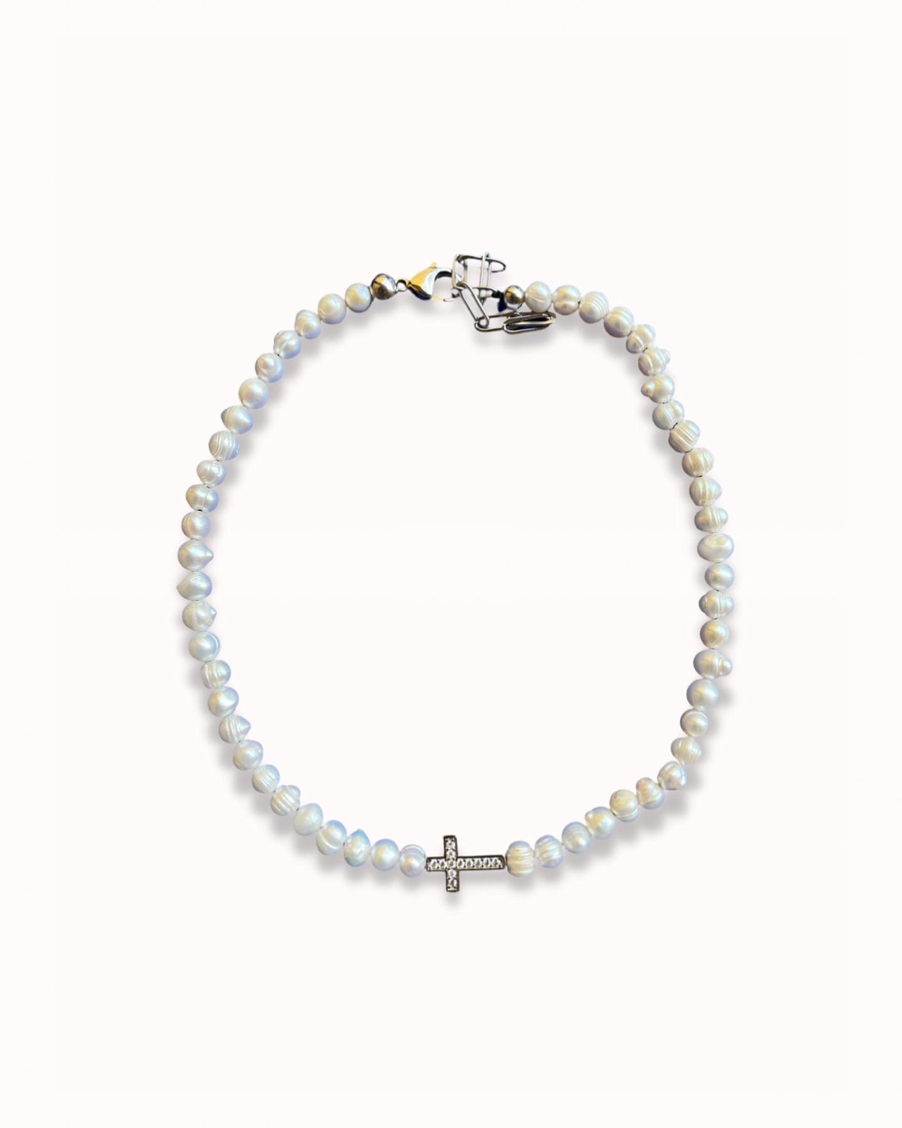 ▪️Perlas naturales, hilo de seda y cruz en acero y circonias.