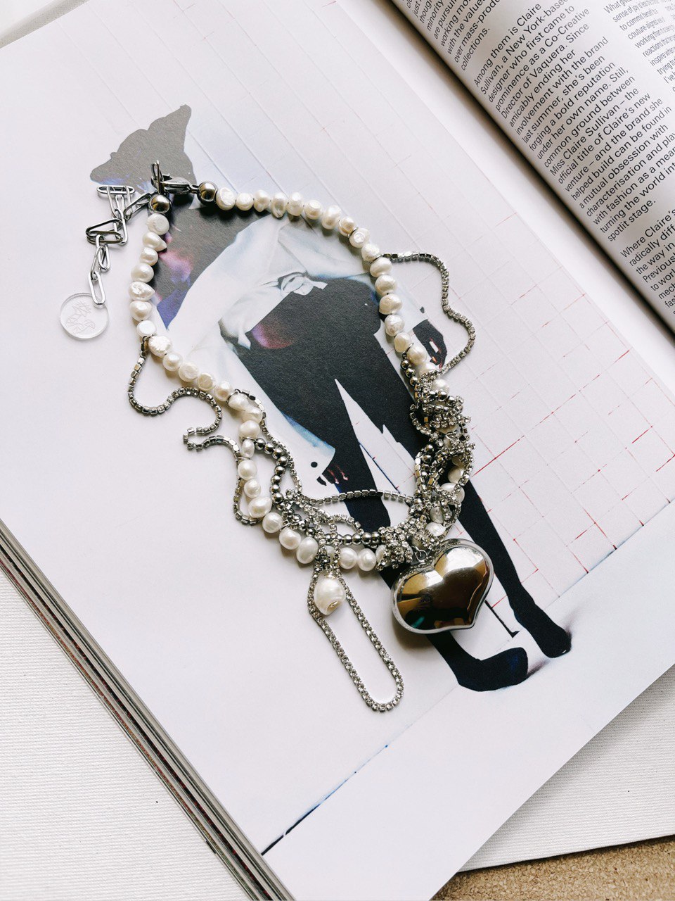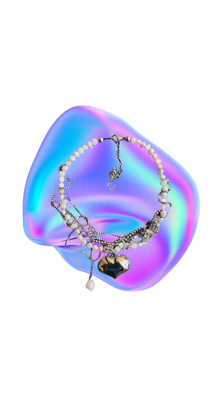 Choker de perlas naturales con detalles en beads de acero y chains de brillantes con un corazón grande en acero en hilo de seda.