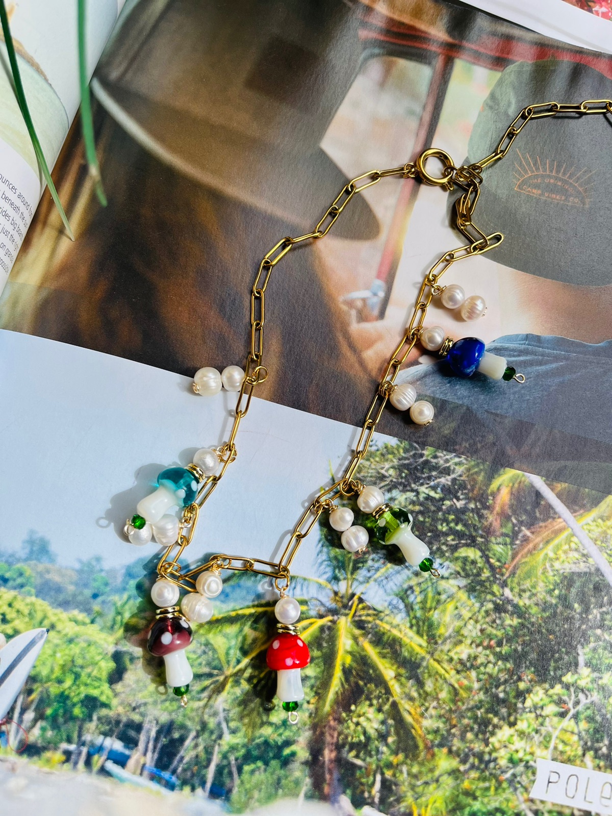 - Thin paper clip chain de acero (non tarnish) con dangling glass charms en forma de honguito, cristales, perlas naturales y detalles en baño.