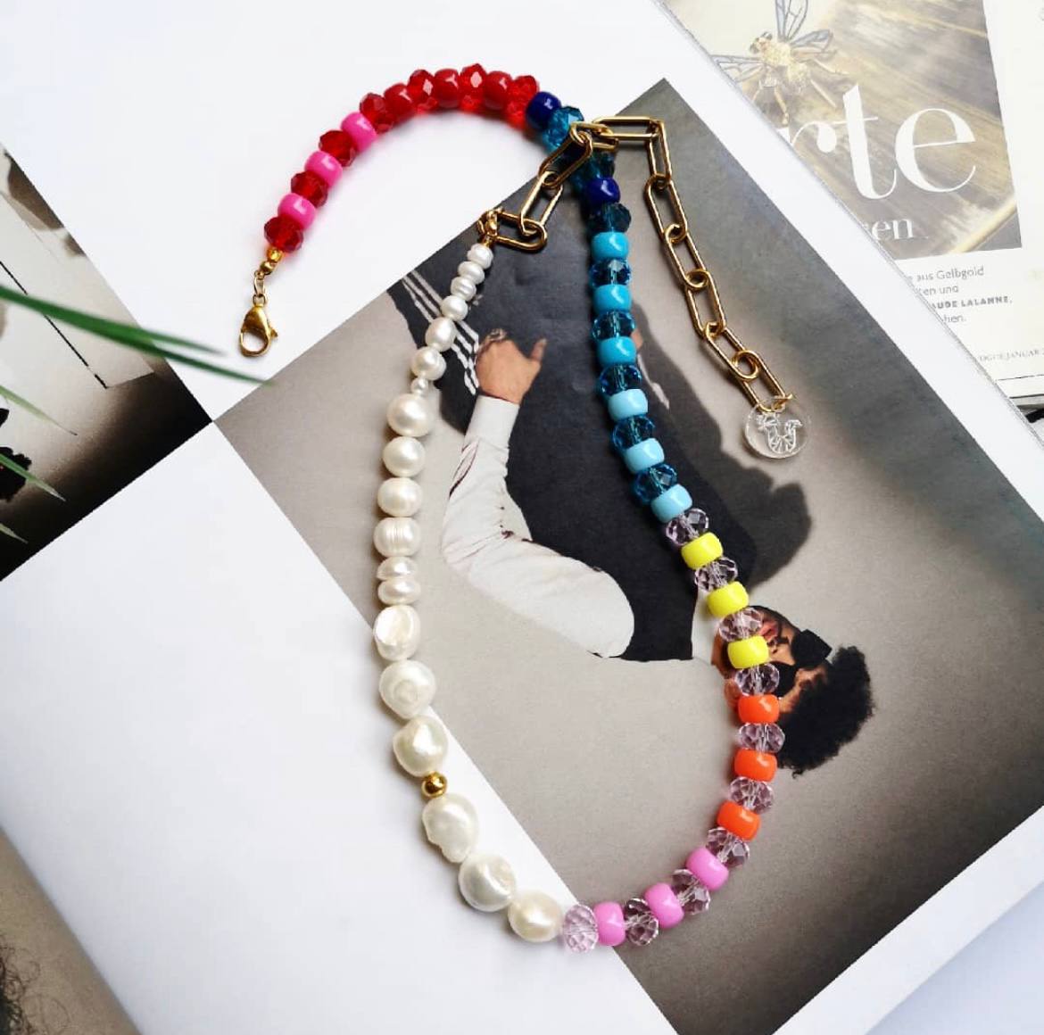 • Collar grueso de Perla Natural de diferente tamaño y beads de acrilico, cristales Happy Face en porcelana.