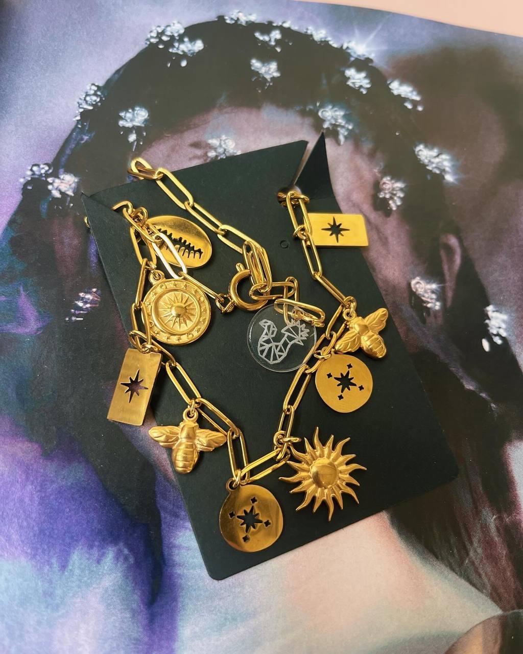 Cadena PaperClip ajustable con una selección especial de dangling charms místicos en acero con baño.
